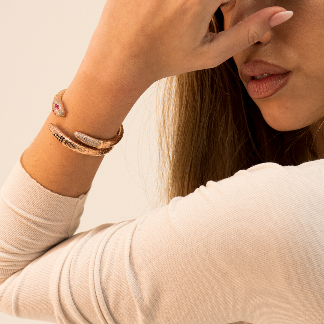Fascino e seduzione da svelare. Il bracciale in argento 925 semi aperto con serpente, classico, dorato, rosa esprime un lato di te nascosto, da mostrare solo in determinate occasioni. Simbolo di intrigo e mistero da sempre il serpente è sinonimo di eleganza senza incertezze.