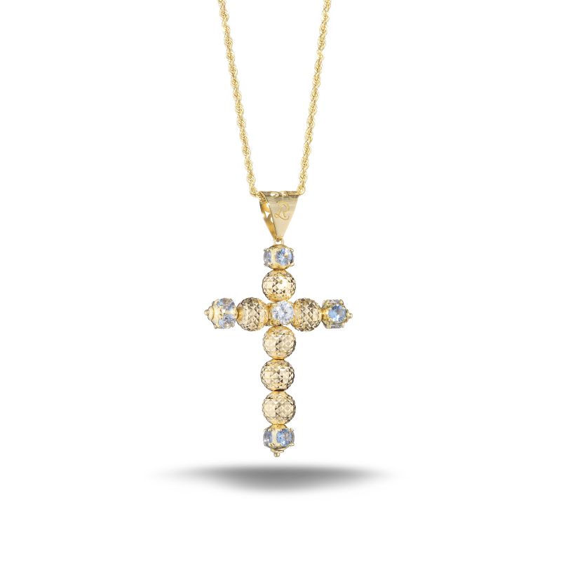 Fa parte della terza capsule della collezione Milleluci la collana con croce impreziosita da sfere sfaccettate da 6 mm e dettagli in sfere azzurre. Una creazione dal fascino luminoso e dall’eleganza senza tempo, pensata per chi ama distinguersi con stile. Un gioiello da non perdere.